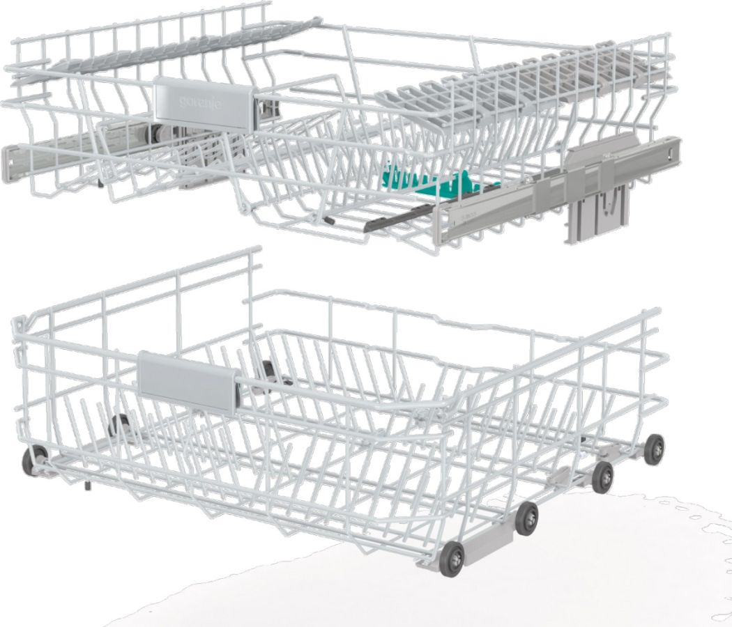 Koše jsou vybaveny zvýrazněnými pohyblivými prvky a přizpůsobitelným rozložením koše pro snadné nakládání. Opravdu jednoduchý dvouúrovňový systém nastavení koše vám umožní umístit i ty největší hrnce a talíře. Stojan na talíře ve spodním koši lze snadno složit. Příbory lze perfektně organizovat na speciálním tácu, kde jsou umístěny odděleně pro dokonalé výsledky čištění a sušení. Každý detail je pečlivě navržen pro co nejjednodušší manipulaci.