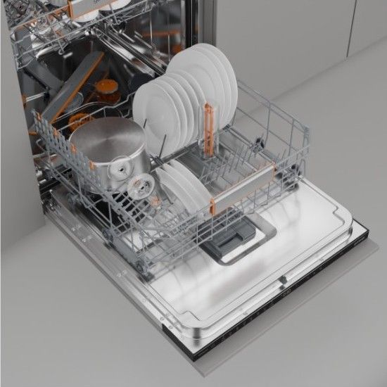Koše jsou vybaveny zvýrazněnými pohyblivými prvky a přizpůsobitelným rozložením pro snadné nakládání. Opravdu jednoduchý dvouúrovňový systém nastavení umožňuje umístit i ty největší hrnce a talíře. Stojan na talíře ve spodním koši lze snadno složit. Příbory lze perfektně organizovat na speciálním tácu, kde jsou umístěny odděleně pro dosažení dokonalých výsledků mytí i sušení. Každý detail je pečlivě navržen pro co nejjednodušší manipulaci.