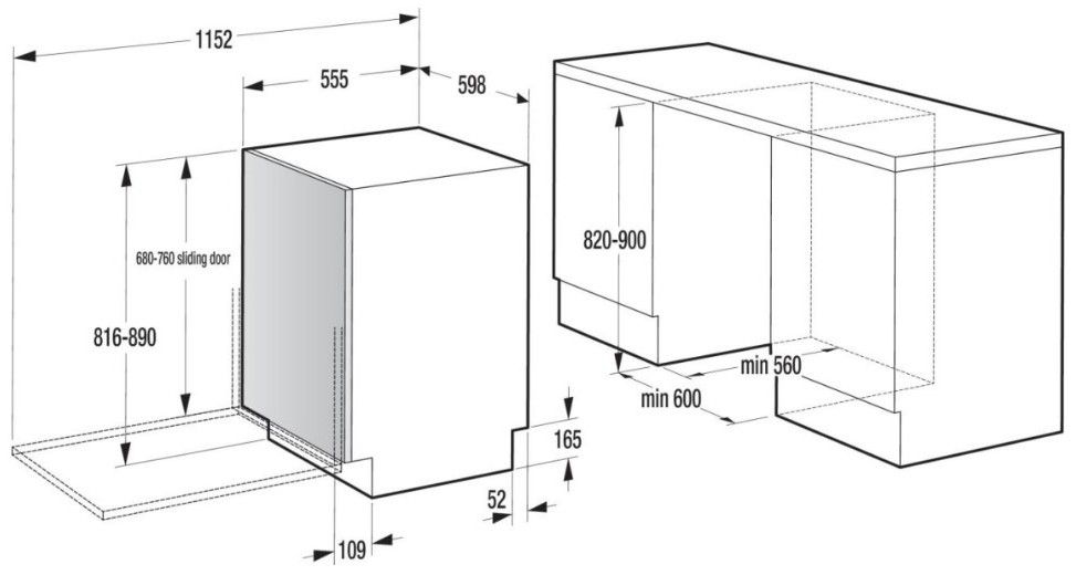Speciální mechanismus posuvných dvířek umožňuje montáž myčky do jakéhokoli typu kuchyňské skříňky bez ohledu na požadovanou délku dekorativních dvířek nebo styl podložky. Vestavěný antisifon navíc umožňuje instalaci myčky v ergonomické výšce bez výřezu pod dvířky!