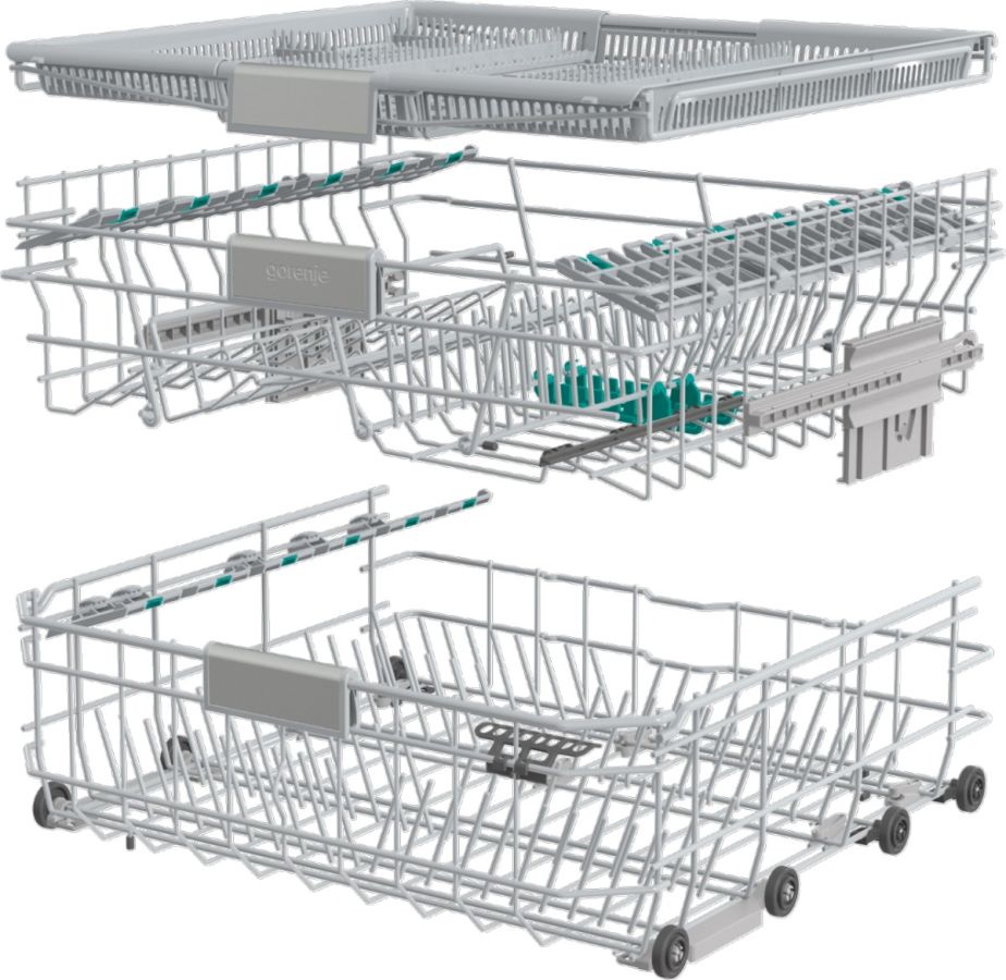 Koše jsou vybaveny zvýrazněnými pohyblivými prvky a přizpůsobitelným rozložením koše pro snadné nakládání. Opravdu jednoduchý dvouúrovňový systém nastavení koše vám umožní umístit i ty největší hrnce a talíře. Stojan na talíře ve spodním koši lze snadno složit. Příbory lze perfektně organizovat na speciálním tácu, kde jsou umístěny odděleně pro dokonalé výsledky mytí a sušení. Každý detail je pečlivě navržen pro co nejjednodušší manipulaci.