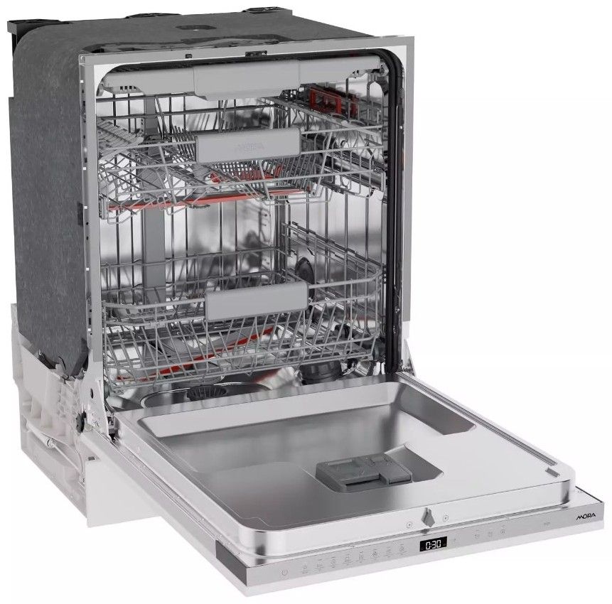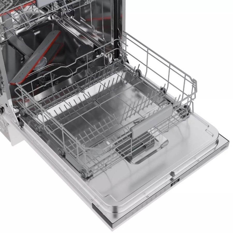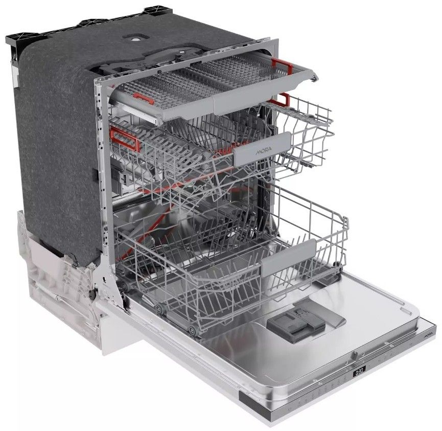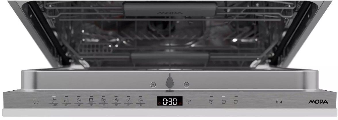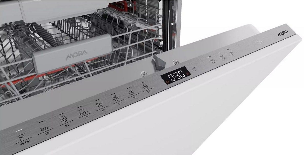 Vestavná plně integrovaná myčka MORA IMB 6675 v úsporné energetické třídě B si při standardní šířce 60 cm poradí s neuvěřitelnými 16 sadami nádobí. Nádobí dokonale umyje díky třem ostřikovacím ramenům a pěti výškovým úrovním proudu vody, takže bude bezvadně čisté, i když bude myčka opravdu plná a nádobí bude hustě naskládané. Je vybavená třemi koši s pohyblivými prvky a přizpůsobitelným nastavením. Vodící lišty v horním koši jsou navíc opatřeny kuličkovými ložisky. Horní koš slouží pro pečlivé a šetrné mytí příborů a kuchyňského náčiní, levý a pravý panel můžete posouvat podle toho, jak velký prostor v horním koši potřebujete. V horním a spodním koši najdete prostor i pro vyšší skleničky na víno. Speciální pryžový materiál je udrží v pevné poloze. Tyto držáky jsou flexibilní a dělitelné, s vyhrazeným prostorem pro různý počet sklenic, aby vyhovovaly vašim potřebám. Skrytý ovládací panel je opatřen dotykovým ovládáním s displejem a mnoha praktickými funkcemi, jako je například RychléMytí, které umožňuje zkrátit délku vybraných programů. Speciální LED světlo instalované na spodní části dvířek myčky neustále indikuje aktuální fázi mycího programu. Vždy tak víte, zda myčka funguje nebo je mycí cyklus u konce. Zvolíte-li funkci SušeníPlus, po ukončení programu se automaticky pootevřou dvířka, aby tak unikla pára a následný sušicí cyklus byl efektivnější a energeticky úsporný. Energii pomáhá šetřit i možnost připojení přímo na teplou vodu pomocí speciální hadice, odolávající vysokým teplotám. Samozřejmostí je úsporný ECO Program nebo AUTO Program, který sám zvolí optimální parametry mytí. Vhod přijde i odložený start až o 24 hodin. Myčka má navíc praktický samočisticí filtr, a tak automaticky odstraní zbytky mastnoty a jídla ve filtru a zamezí nesprávnému chodu spotřebiče. Se systémem AquaStop se nemusíte obávat nemilého překvapení v podobě vytopení. Myčka je osazená novým výkonným invertorovým motorem a dokonce se i sama vyčistí – stačí jednou za měsíc pustit automatický program čiťtění, který vyčistí vanu, ostřikovací ramena i trysky.