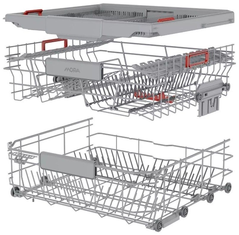 Myčky MORA s kapacitou až 16 jídelních souprav disponují 3 koši se zvýrazněnými pohyblivými prvky, díky kterým můžete jednoduše přizpůsobit interiér koše podle aktuálních potřeb. Horní koš můžete zvednout i při plném naložení, takže získáte prostor pro vložení i objemných hrnců, pekáčů nebo servírovacích podnosů. Příbory lze perfektně uspořádat v příborové zásuvce, kde se vzájemně nepoškrábou a mohou se dokonale vysušit.