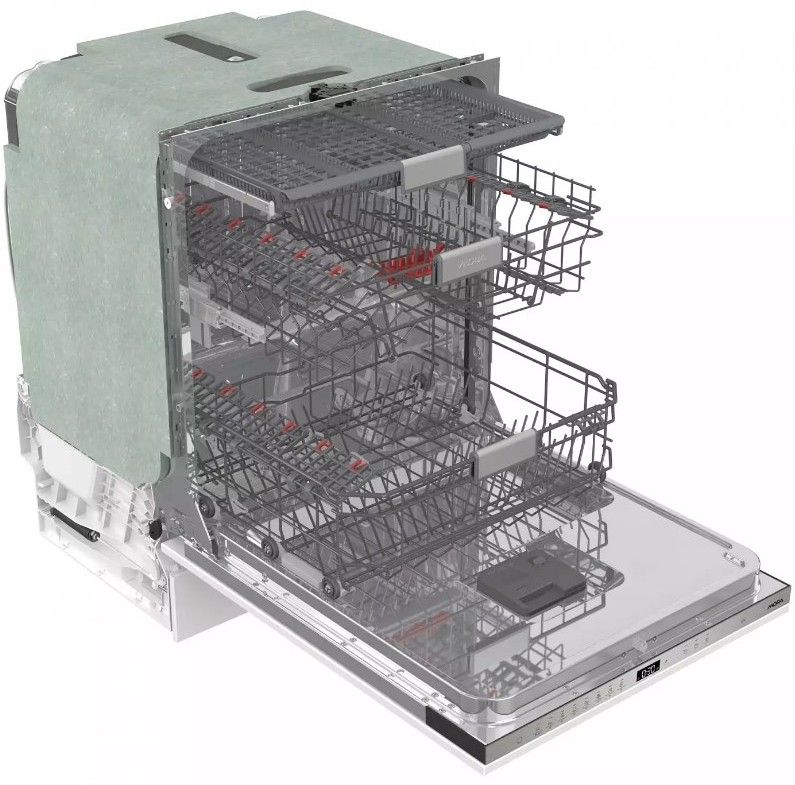 Myčky MORA s kapacitou až 16 jídelních souprav disponují 3 koši se zvýrazněnými pohyblivými prvky, díky kterým můžete jednoduše přizpůsobit interiér koše podle aktuálních potřeb. Horní koš můžete zvednout i při plném naložení, takže získáte prostor pro vložení i objemných hrnců, pekáčů nebo servírovacích podnosů. Příbory lze perfektně uspořádat v příborové zásuvce, kde se vzájemně nepoškrábou a mohou se dokonale vysušit.