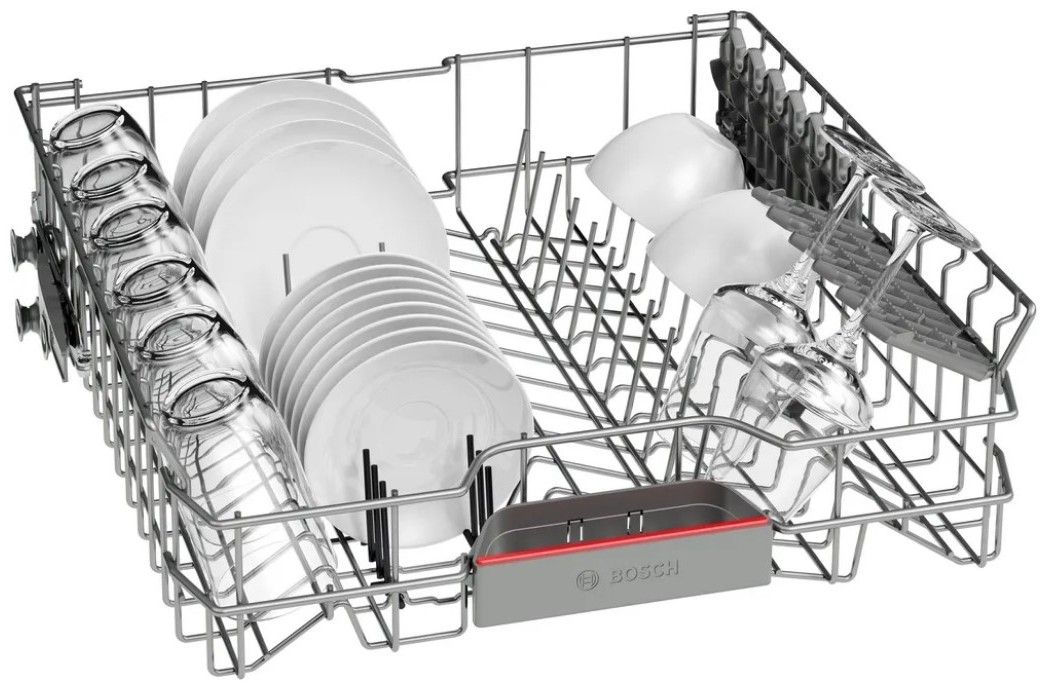 Koše VarioFlex a příborová zásuvka VarioDrawer: systém košů VarioFlex je zárukou vysoké flexibility a pohodlí při manipulaci s koši. To je zajištěno osmi pohyblivými prvky v horním koši (držák na sklo, sklopné trny a etažéry). Díky červeně označeným úchytům vždy hned vidíte, kde a jak můžete přizpůsobit koše podle druhu vkládaného nádobí. Spodní koš nabízí dokonce devět pohyblivých prvků (vyšší držák na sklo vzadu, sklopné trny a etažéry). Sklopné trny navíc nabízejí zvláštní ochranu a stabilitu nádobí díky zaobleným koncům. A díky madlům z nerezu je vše pohodně a rychle dostupné. - Silence on demand: potlačení hluku až na 30 minut prostřednictvím aplikace Home Connect.