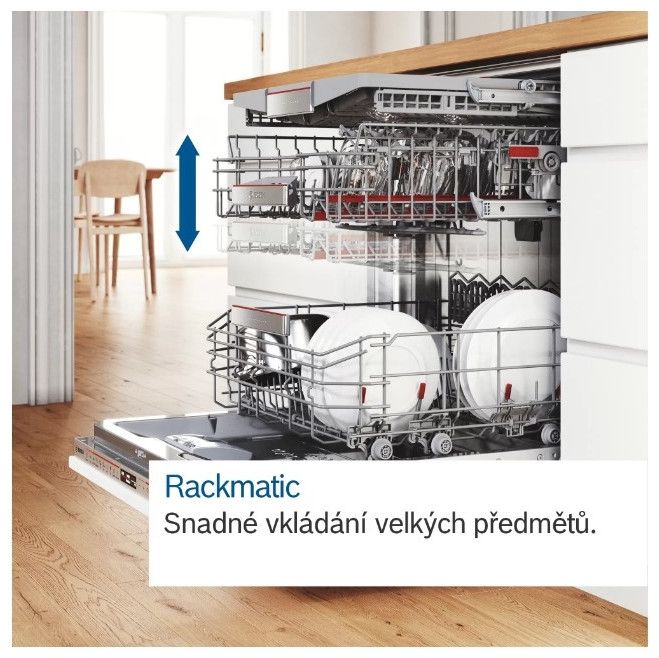 Díky systému Rackmatic může být výška horního koše jednoduše přenastavena až o 5 cm. A můžete to udělat, i když je koš plně naložený. To znamená ještě více možností nastavení a tím maximální flexibilitu.