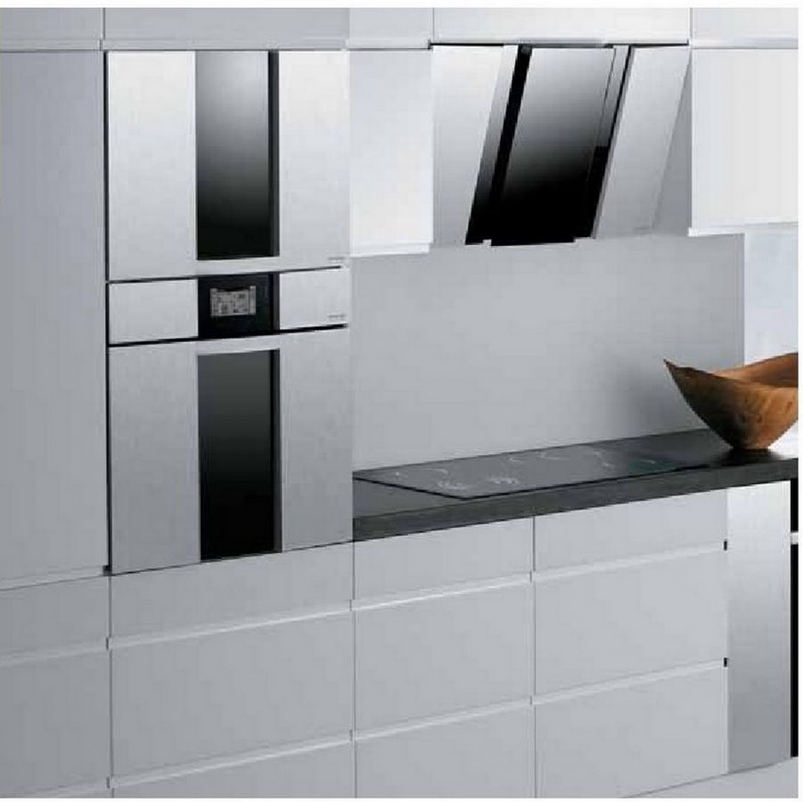 Digestoř má úžasnou konstrukci. Na první pohled vás zaujmou protiklady - je vzrušující, i když zanechává dojem vnitřní rovnováhy a naplnění. Linka se setkává s křivkou. Sklo se setkává s hliníkem. Šedivá se setkává s černou. Jemné se setkává s tvrdým. Těmito kombinacemi nezískáte pouze dokonalý materiál a linii, ale také účinnou a super tichou digestoř.