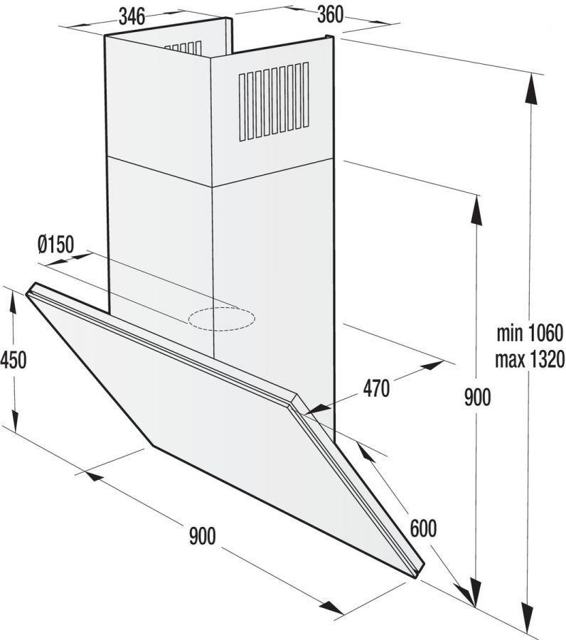 Komínový odsavač na stěnu se 3 rychlostmi výkonu, zvýšeným prouděním vzduchu, zpětnou klapkou a možností odtahu nebo recirkulace. Výkon odsavače 508 m3/h.