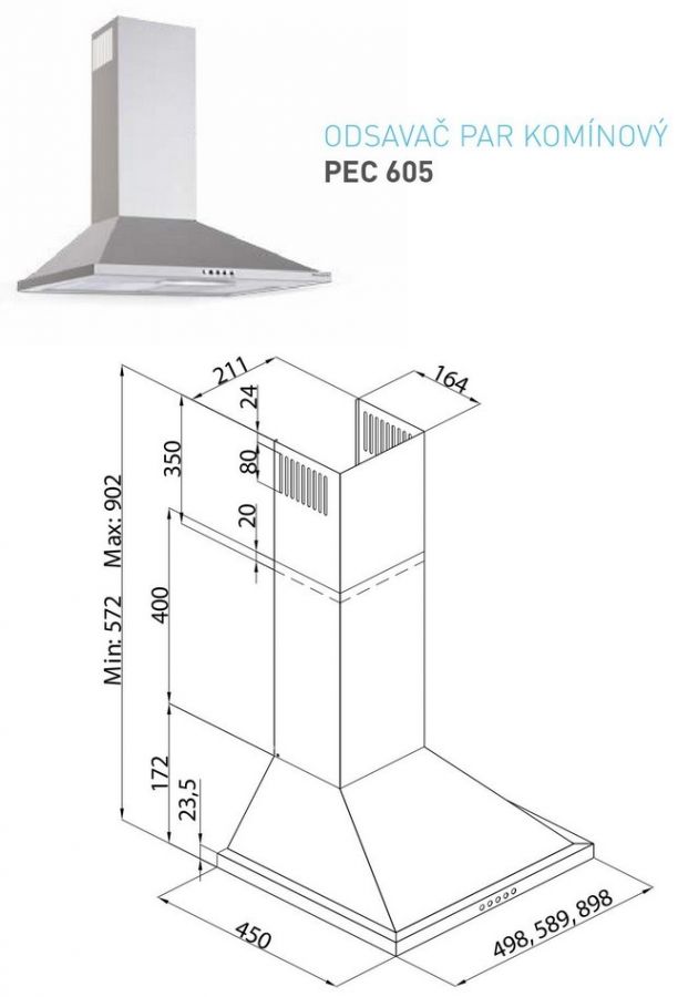 Komínový odsavač na stěnu se 3 rychlostmi výkonu, tlačítkovým ovládáním, zpětnou klapkou a možností odtahu nebo recirkulace. Výkon odsavače 270 m3/h.