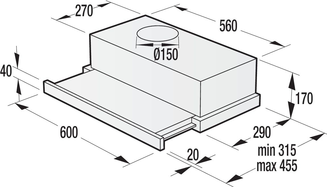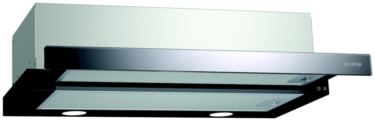 Vestavný, výsuvný odsavač se 3 rychlostmi výkonu, zpětnou klapkou a možností odtahu nebo recirkulace. Výkon odsavače 435 m3/h.