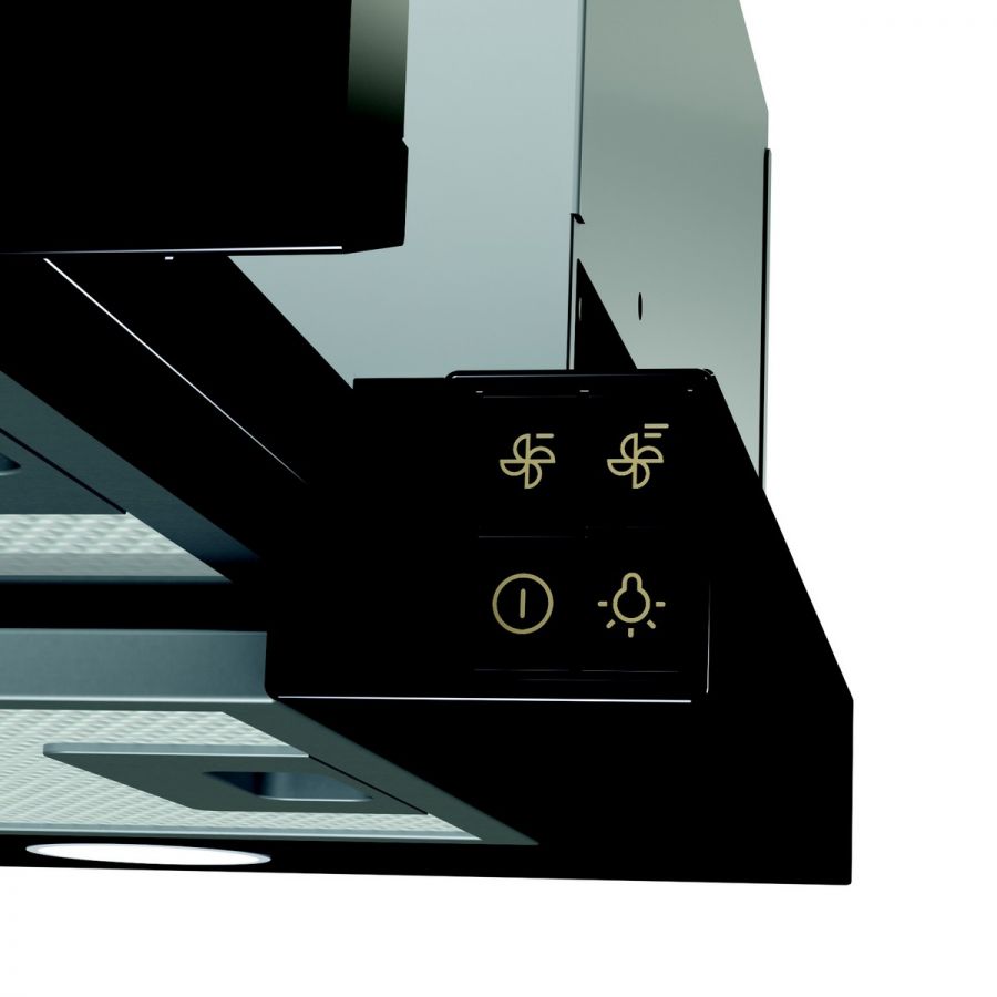 Vestavný, výsuvný odsavač se 3 rychlostmi výkonu, zpětnou klapkou a možností odtahu nebo recirkulace. Výkon odsavače 435 m3/h.
