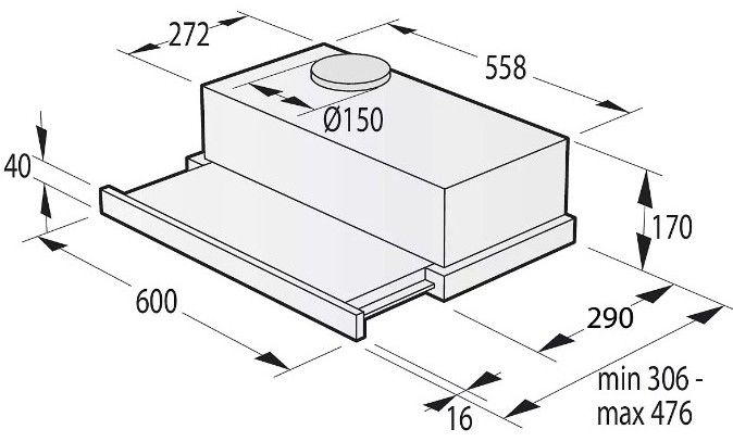 Vestavný, výsuvný odsavač se 3 rychlostmi výkonu, zpětnou klapkou a možností recirkulace. Výkon odsavače 350 m3/h.