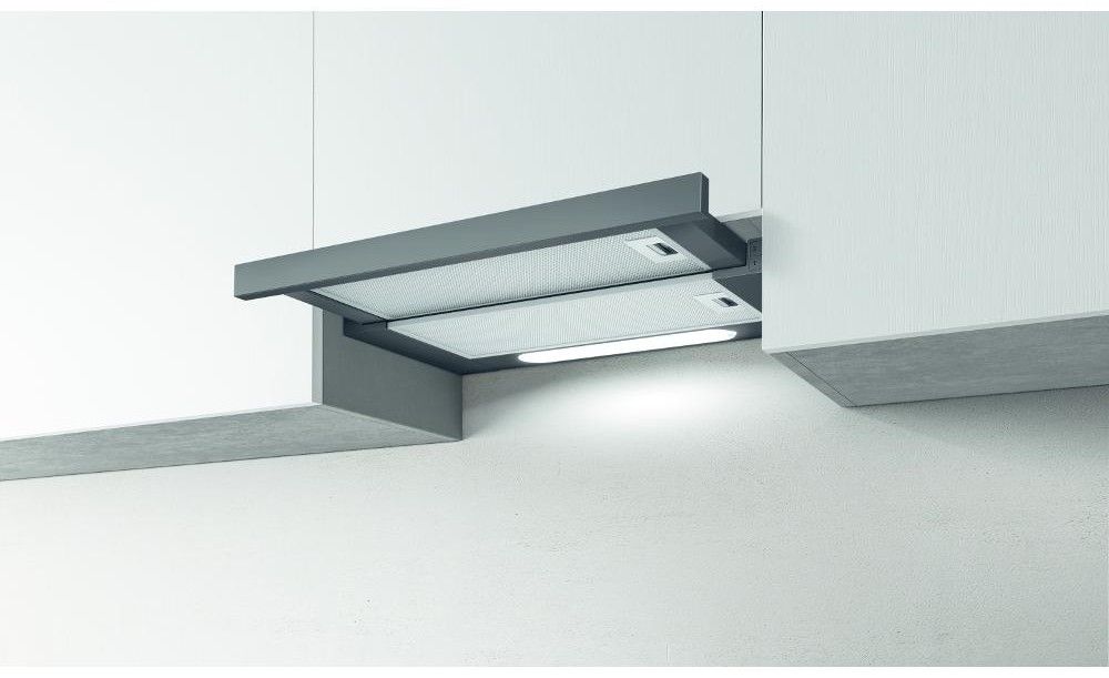 Vestavný, výsuvný odsavač se 3 rychlostmi výkonu, tlačítkovým ovládáním a možností odtahu i recirkulace. Výkon odsavače 304 m3/h.