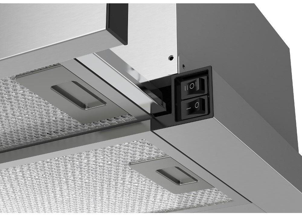 Vestavný, výsuvný odsavač se 2 rychlostmi výkonu, tlačítkovým ovládáním a možností odtahu i recirkulace. Výkon odsavače 331 m3/h.