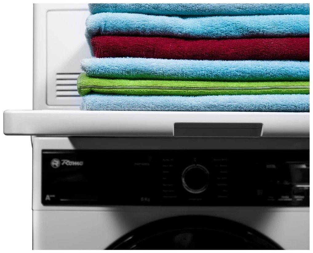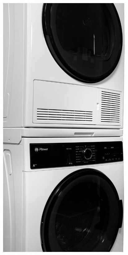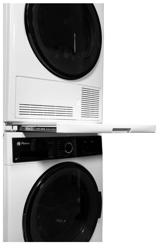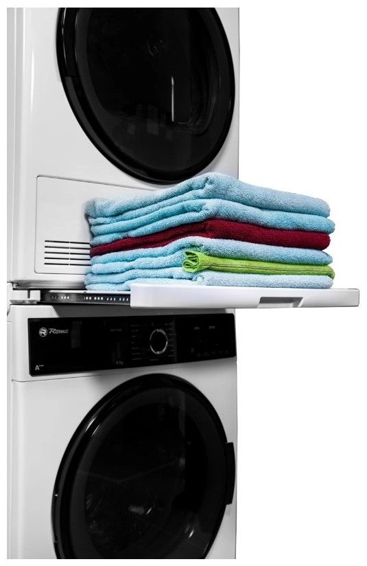 Spojovací mezikus mezi pračku a sušičku s výsuvnou odkládací poličkou. Kompatibilní s modely praček ROMO řady RWF (s kapacitou 7 kg a více a hloubkou alespoň 52 cm) a sušiček ROMO řady RHD a RCD (s kapacitou 7 kg a více). Maximální nosnost výsuvné poličky: 15 kg.