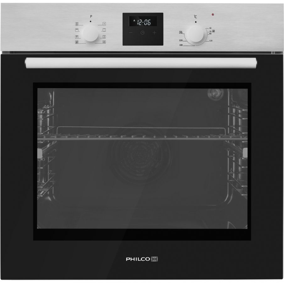 Vestavná multifunkční trouba Philco POB 6010 X v nerezovém provedení o objemu 60 litrů s funkcí minutky a bílým displejem. Součástí příslušenství trouby je extra hluboký plech o objemu až 8 litrů.