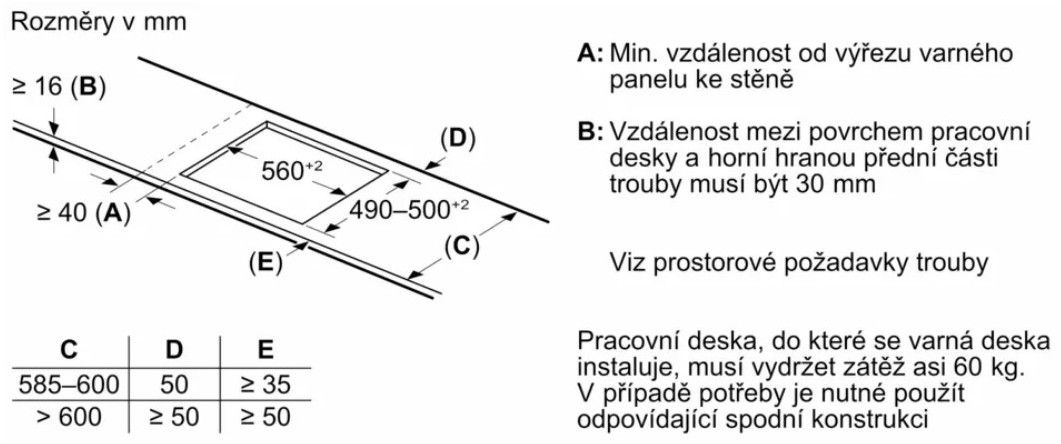 Požadovaná velikost otvoru pro instalaci (v x š x h): 51 x 560-560 x 490-500 mm