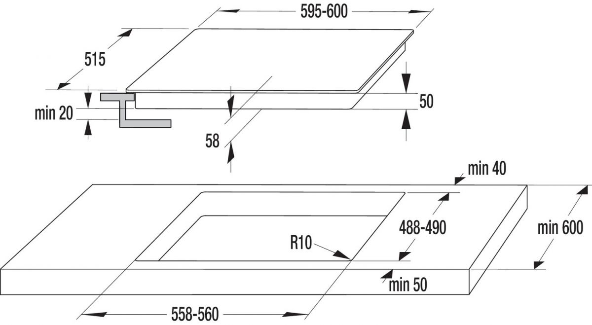 - Vpravo vzadu: Indukční varná zóna ø 20×20 cm, 1.8/3 kW