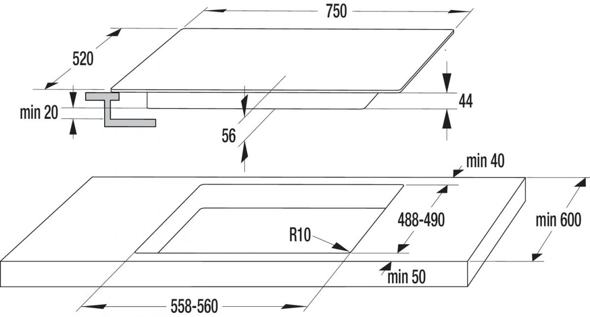 - Vlevo vpředu: Indukční varná zóna ø 20×20 cm, 1.8/3 kW