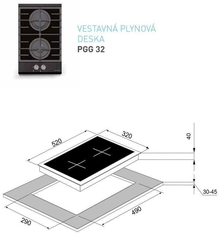 Vestavná plynová deska se 2 hořáky. Má odolnou litinovou mřížku, thermoelektrickou pojistku a integrované zapalování.