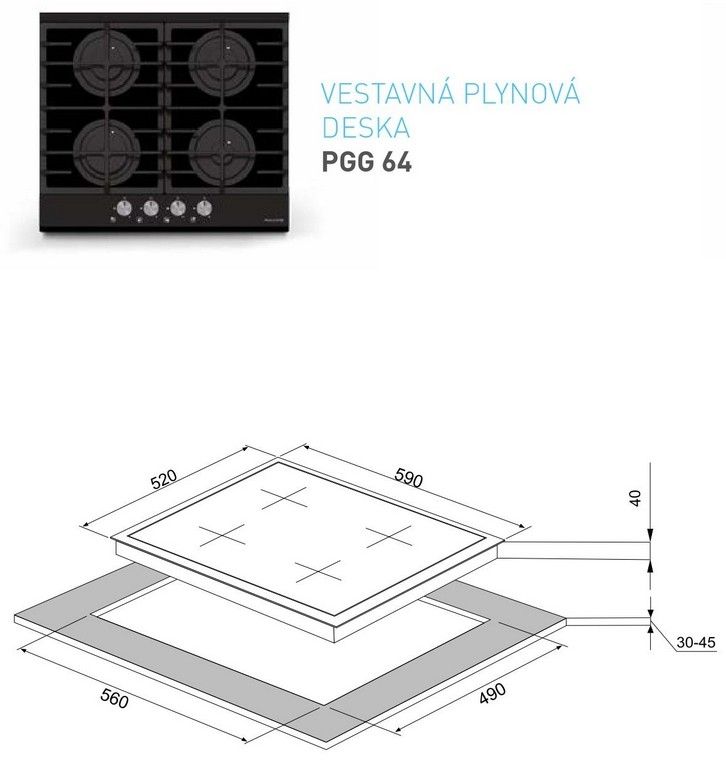Vestavná plynová deska se 4 hořáky. Má ovládání otočnými ovladači, vysoce kvalitní bezpečnostní sklo, odolné litinové mřížky a bezpečnostní termoelektrickou pojistku.